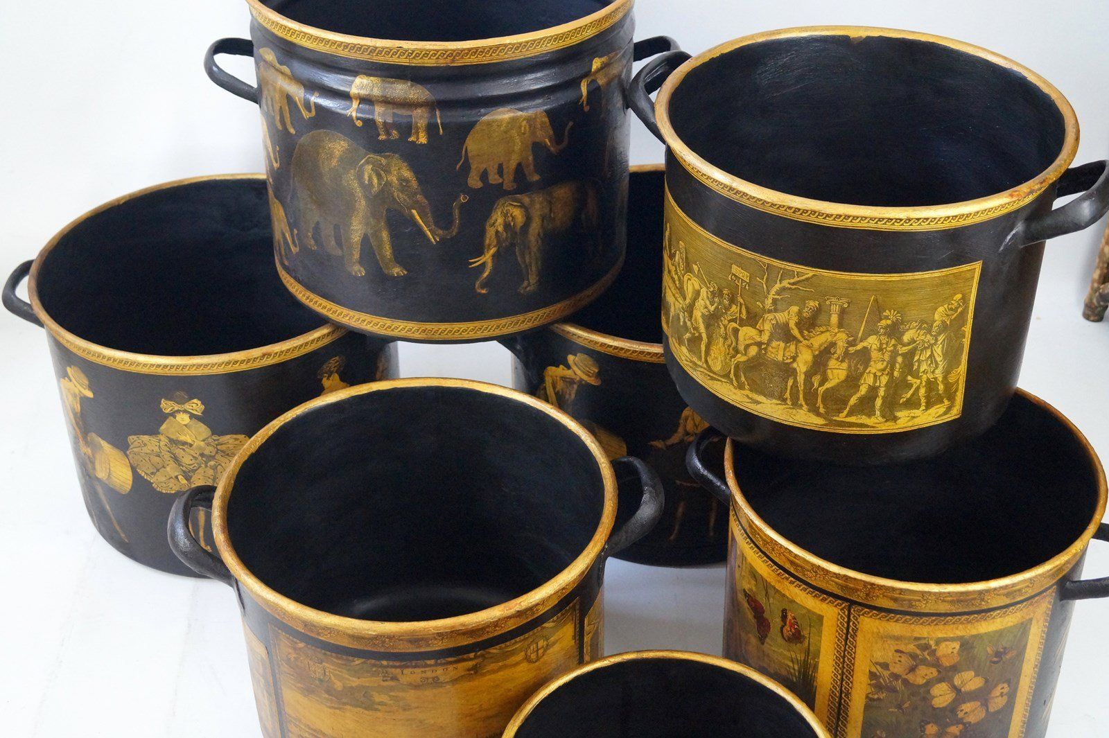 After painting them black, occasionally with a hint of gilt, we decorate them with decoupage, using 19th century images and a Victorian style.